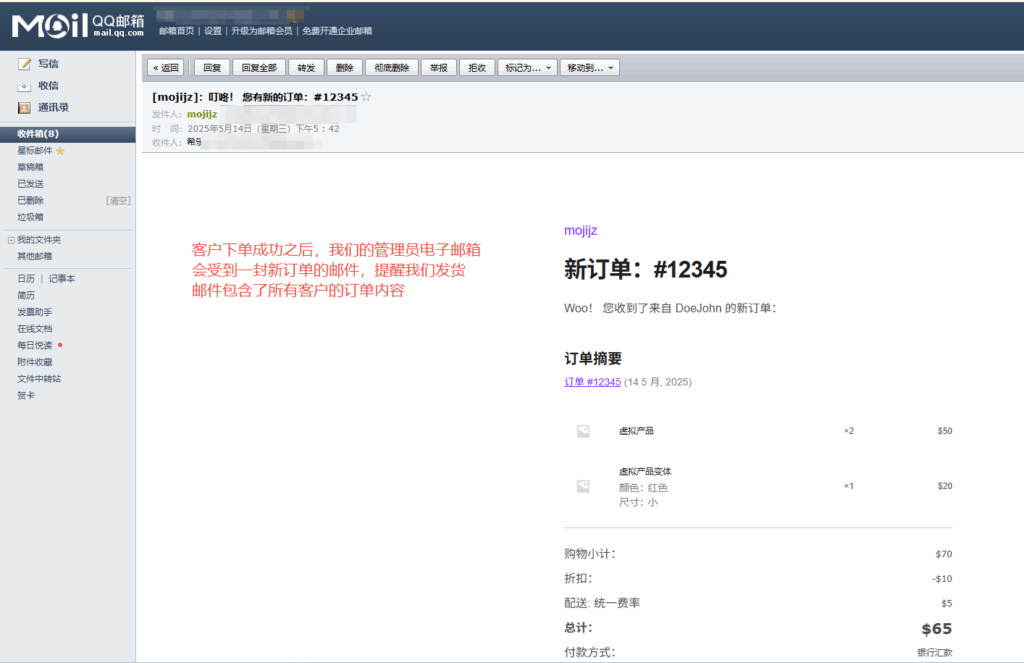 第一步:客户在我们的网站进行下单,下单成功之后我们的管理员电子邮箱会收到一封电子邮件,里面有详细的订单信息,提示我们给客户进行发货。