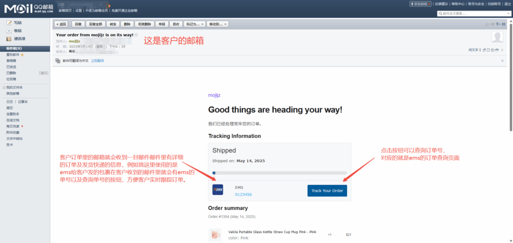 首先,客户在我们网站上下单成功之后,我们在woocommerce中填写的新订单的邮箱里会收到一封邮件,邮件包含了客户的订单信息,然后我们拿到订单信息之后给客户进行发货,发货完成之后我们得到一个物流单号,把物流单号在订单位置填写号,把订单状态改为shipped,然后客户在订单信息里填写的邮箱就会收到我们的发货信息,客户可以通过我们的物流商订单查询系统可以随时关注货物的物流情况。